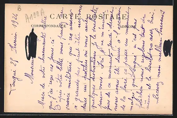 Personenbezogene Daten auf der Rückseite der Karte wurden durch blauen Textmarker unkenntlich gemacht. Die blauen Stellen sind auf die Vorderseite durchgeweicht und wirken sich negativ auf das Postkartenfoto aus