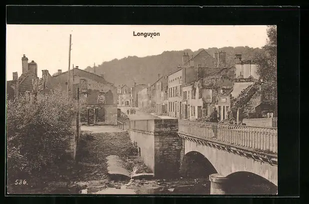 AK Longuyon, Zerstörte Ortspartie mit einem Soldaten
