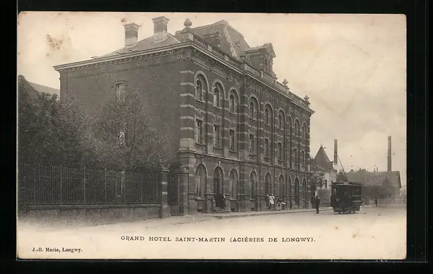 AK Longwy, Grand Hotel Saint-Martin, Strassenbahn unterwegs