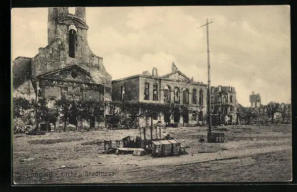 AK Longwy, Kirche und Stadthaus in Trümmern