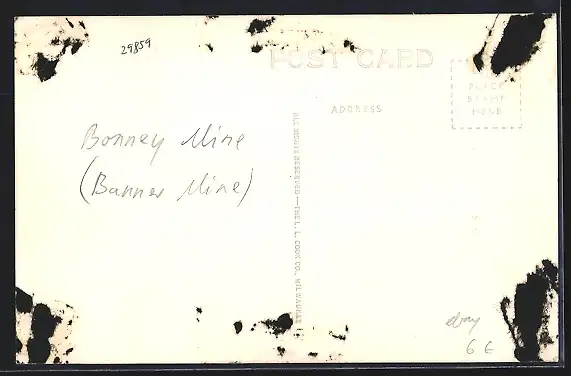 Personenbezogene Daten auf der Rückseite der Karte wurden durch blauen Textmarker unkenntlich gemacht. Die blauen Stellen sind auf die Vorderseite durchgeweicht und wirken sich negativ auf das Postkartenfoto aus