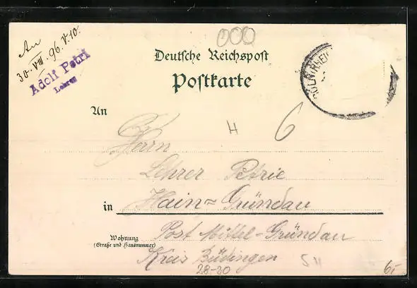Personenbezogene Daten auf der Rückseite der Karte wurden durch blauen Textmarker unkenntlich gemacht. Die blauen Stellen sind auf die Vorderseite durchgeweicht und wirken sich negativ auf das Postkartenfoto aus