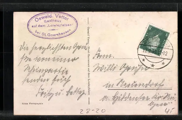 Personenbezogene Daten auf der Rückseite der Karte wurden durch blauen Textmarker unkenntlich gemacht. Die blauen Stellen sind auf die Vorderseite durchgeweicht und wirken sich negativ auf das Postkartenfoto aus