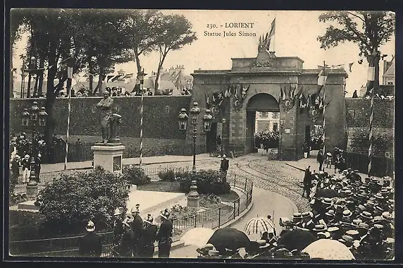 AK Lorient, Statue Jules Simon devant une foule rassemblée près de l`entrée monumentale