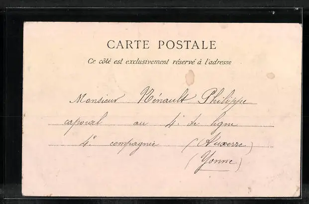 Personenbezogene Daten auf der Rückseite der Karte wurden durch blauen Textmarker unkenntlich gemacht. Die blauen Stellen sind auf die Vorderseite durchgeweicht und wirken sich negativ auf das Postkartenfoto aus