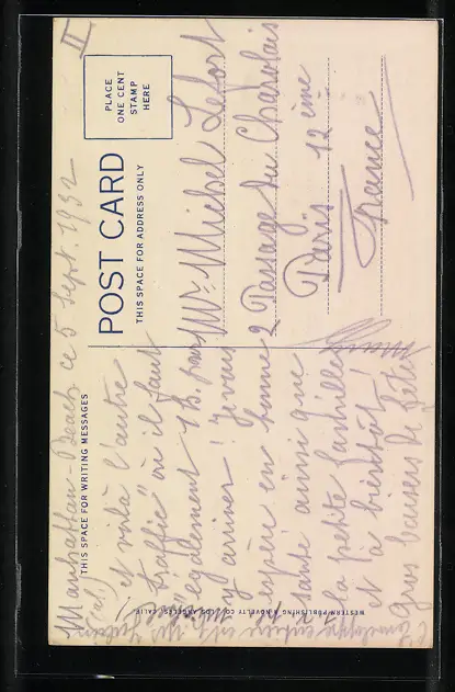 Personenbezogene Daten auf der Rückseite der Karte wurden durch blauen Textmarker unkenntlich gemacht. Die blauen Stellen sind auf die Vorderseite durchgeweicht und wirken sich negativ auf das Postkartenfoto aus