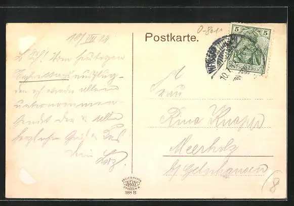 alte Ansichtskarte, gelaufen 1912, rückseitig Klebe- und Papierreste, rückseitig Oberflächenschaden, Eckknick oben re.