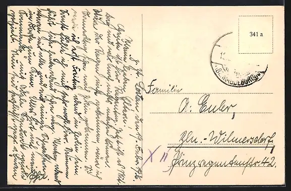 Personenbezogene Daten auf der Rückseite der Karte wurden durch blauen Textmarker unkenntlich gemacht. Die blauen Stellen sind auf die Vorderseite durchgeweicht und wirken sich negativ auf das Postkartenfoto aus