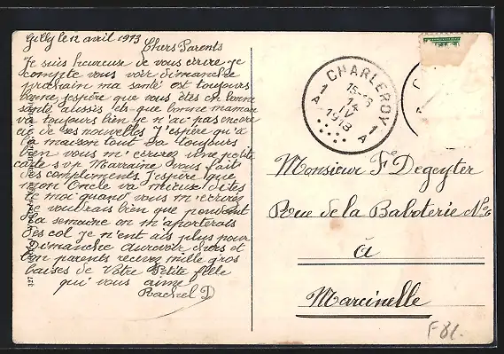 gelaufen 1913, Briefmarke entfernt, rückseitig Oberflächenschaden, Eckknick li. oben, guter Zustand
