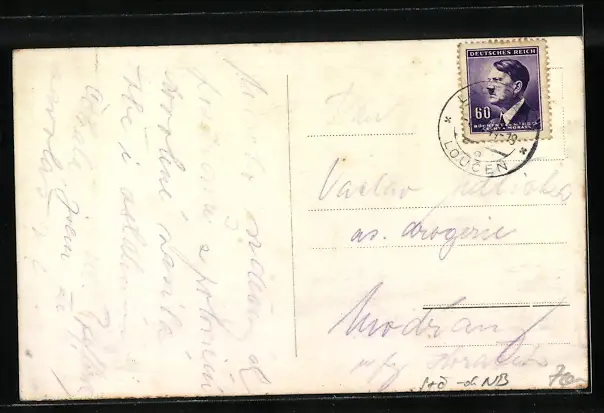 Personenbezogene Daten auf der Rückseite der Karte wurden durch blauen Textmarker unkenntlich gemacht. Die blauen Stellen sind auf die Vorderseite durchgeweicht und wirken sich negativ auf das Postkartenfoto aus