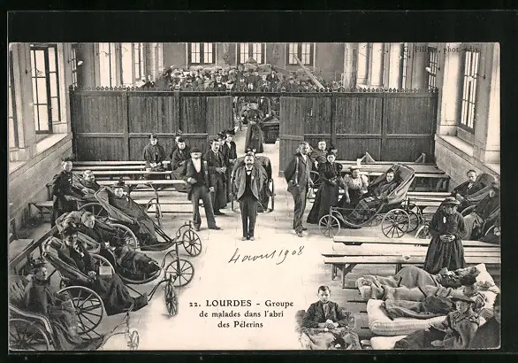AK Lourdes, Groupe de malades dans l'abri des Pélerins