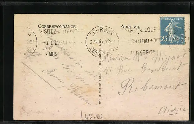 Personenbezogene Daten auf der Rückseite der Karte wurden durch blauen Textmarker unkenntlich gemacht. Die blauen Stellen sind auf die Vorderseite durchgeweicht und wirken sich negativ auf das Postkartenfoto aus