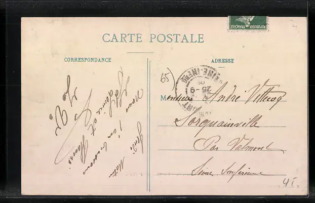 Personenbezogene Daten auf der Rückseite der Karte wurden durch blauen Textmarker unkenntlich gemacht. Die blauen Stellen sind auf die Vorderseite durchgeweicht und wirken sich negativ auf das Postkartenfoto aus