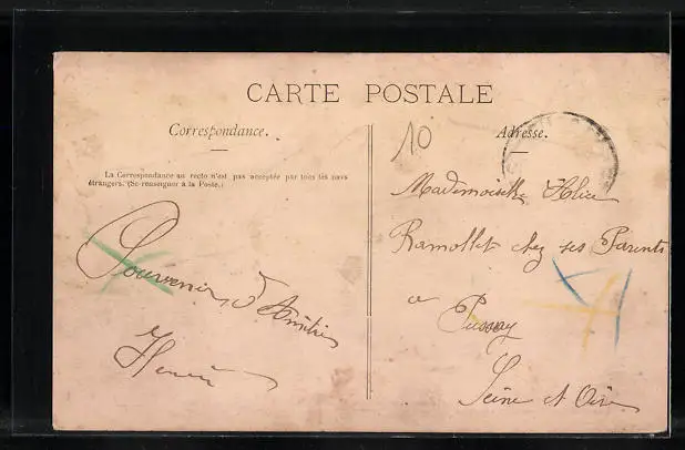 Personenbezogene Daten auf der Rückseite der Karte wurden durch blauen Textmarker unkenntlich gemacht. Die blauen Stellen sind auf die Vorderseite durchgeweicht und wirken sich negativ auf das Postkartenfoto aus