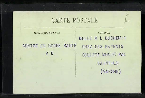 Personenbezogene Daten auf der Rückseite der Karte wurden durch blauen Textmarker unkenntlich gemacht. Die blauen Stellen sind auf die Vorderseite durchgeweicht und wirken sich negativ auf das Postkartenfoto aus