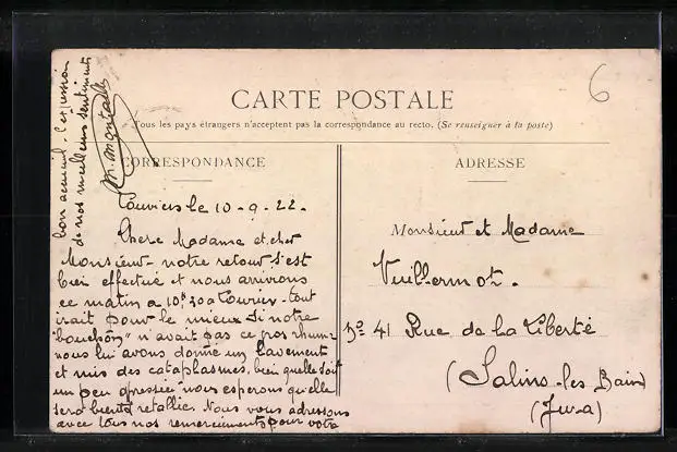 Personenbezogene Daten auf der Rückseite der Karte wurden durch blauen Textmarker unkenntlich gemacht. Die blauen Stellen sind auf die Vorderseite durchgeweicht und wirken sich negativ auf das Postkartenfoto aus