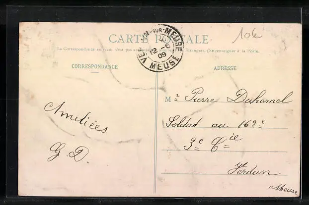 Personenbezogene Daten auf der Rückseite der Karte wurden durch blauen Textmarker unkenntlich gemacht. Die blauen Stellen sind auf die Vorderseite durchgeweicht und wirken sich negativ auf das Postkartenfoto aus