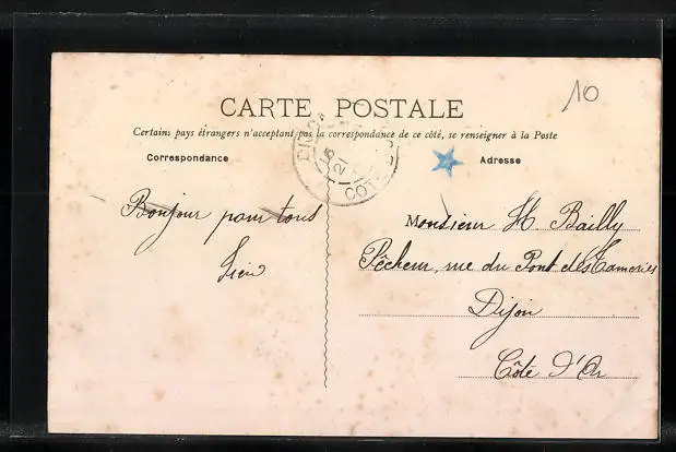 Personenbezogene Daten auf der Rückseite der Karte wurden durch blauen Textmarker unkenntlich gemacht. Die blauen Stellen sind auf die Vorderseite durchgeweicht und wirken sich negativ auf das Postkartenfoto aus