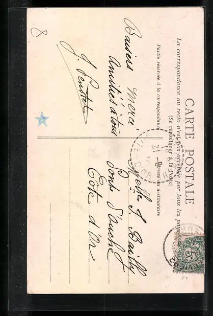 Personenbezogene Daten auf der Rückseite der Karte wurden durch blauen Textmarker unkenntlich gemacht. Die blauen Stellen sind auf die Vorderseite durchgeweicht und wirken sich negativ auf das Postkartenfoto aus