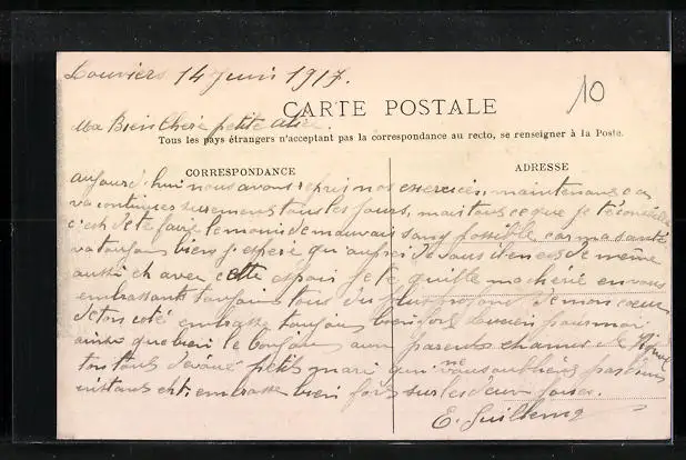 Personenbezogene Daten auf der Rückseite der Karte wurden durch blauen Textmarker unkenntlich gemacht. Die blauen Stellen sind auf die Vorderseite durchgeweicht und wirken sich negativ auf das Postkartenfoto aus