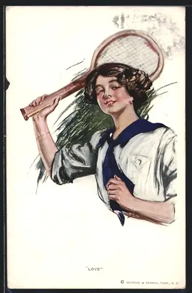 AK Love, Junge Dame mit erhobenem Tennisschläger