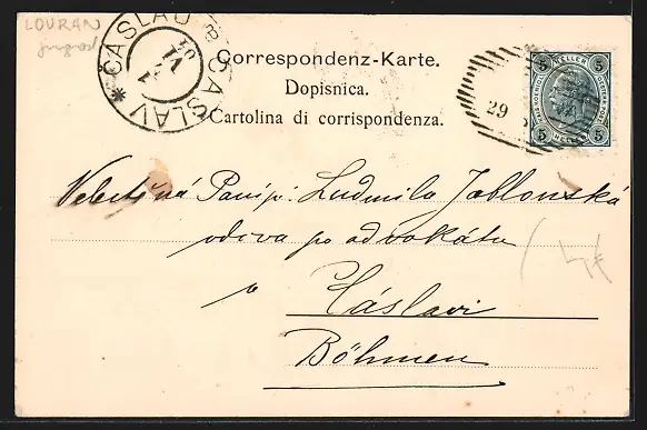 Personenbezogene Daten auf der Rückseite der Karte wurden durch blauen Textmarker unkenntlich gemacht. Die blauen Stellen sind auf die Vorderseite durchgeweicht und wirken sich negativ auf das Postkartenfoto aus