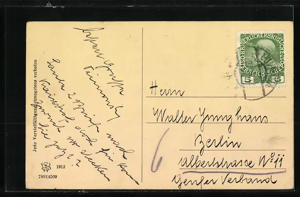 Personenbezogene Daten auf der Rückseite der Karte wurden durch blauen Textmarker unkenntlich gemacht. Die blauen Stellen sind auf die Vorderseite durchgeweicht und wirken sich negativ auf das Postkartenfoto aus