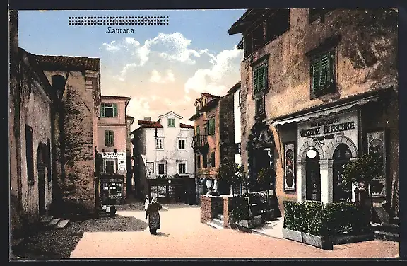 AK Lovrana, Strassenpartie mit Bäckerei