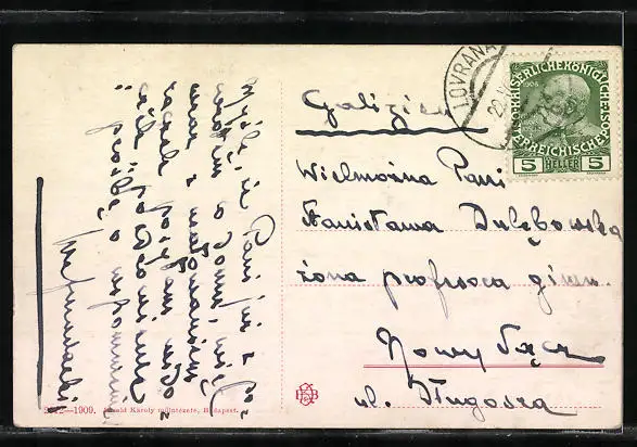 Personenbezogene Daten auf der Rückseite der Karte wurden durch blauen Textmarker unkenntlich gemacht. Die blauen Stellen sind auf die Vorderseite durchgeweicht und wirken sich negativ auf das Postkartenfoto aus