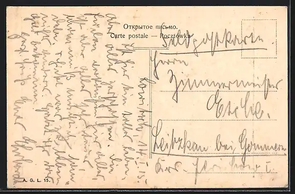 Personenbezogene Daten auf der Rückseite der Karte wurden durch blauen Textmarker unkenntlich gemacht. Die blauen Stellen sind auf die Vorderseite durchgeweicht und wirken sich negativ auf das Postkartenfoto aus