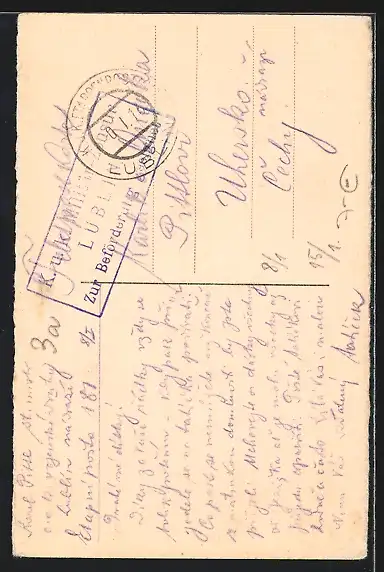 Personenbezogene Daten auf der Rückseite der Karte wurden durch blauen Textmarker unkenntlich gemacht. Die blauen Stellen sind auf die Vorderseite durchgeweicht und wirken sich negativ auf das Postkartenfoto aus