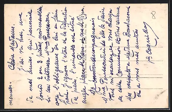 Personenbezogene Daten auf der Rückseite der Karte wurden durch blauen Textmarker unkenntlich gemacht. Die blauen Stellen sind auf die Vorderseite durchgeweicht und wirken sich negativ auf das Postkartenfoto aus
