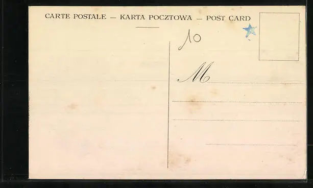 Personenbezogene Daten auf der Rückseite der Karte wurden durch blauen Textmarker unkenntlich gemacht. Die blauen Stellen sind auf die Vorderseite durchgeweicht und wirken sich negativ auf das Postkartenfoto aus