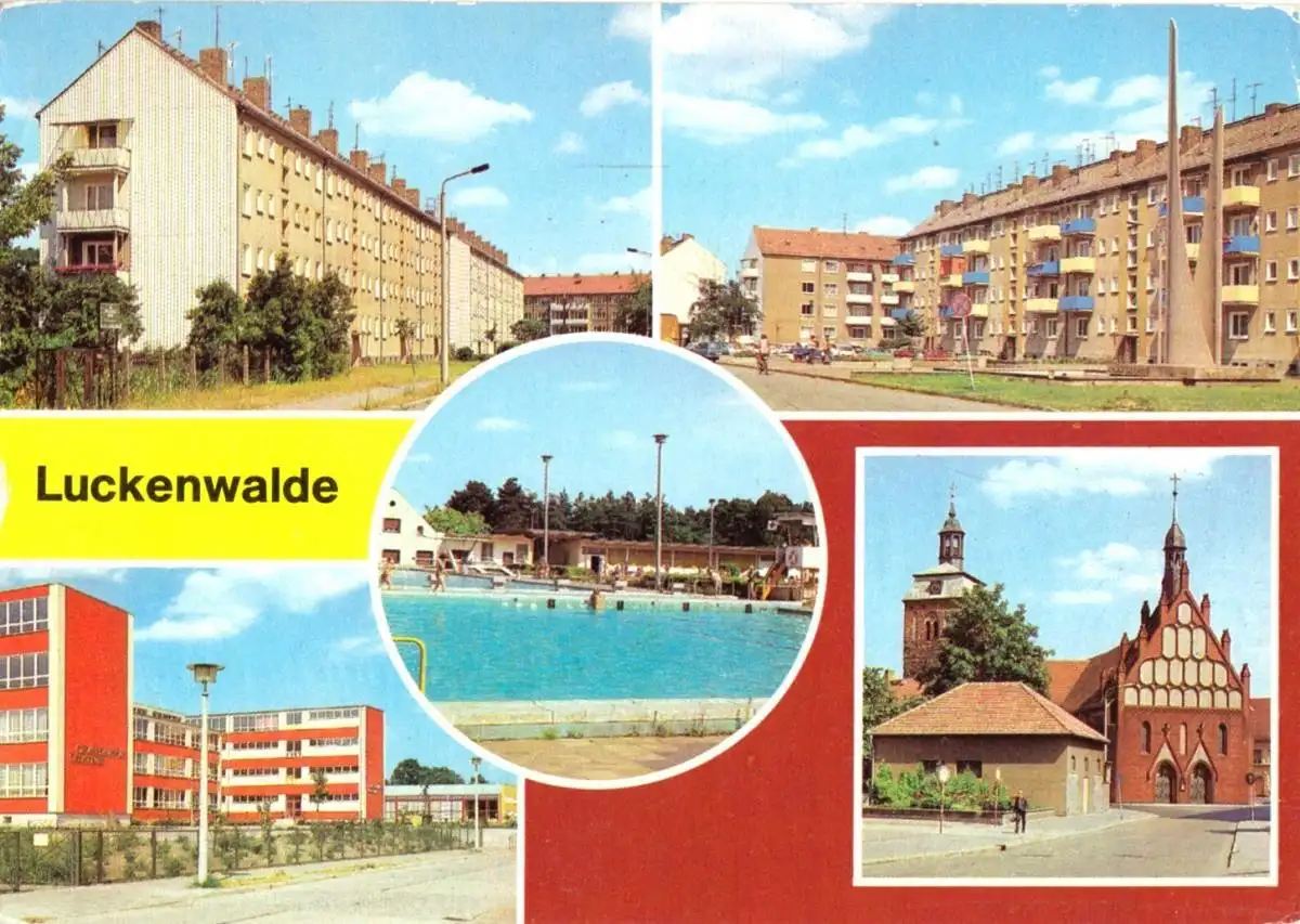 Ansichtskarte Luckenwalde fünf Abb. - Str. der DSF, Leninplatz, Oberschulen, Freibad, Platz der Jugend Erhaltung I-II, Beförderungsspuren postalisch gelaufen, gestempelt: Luckenwalde, 9.11.82 Druckvermerk: 1982 Herstellungsland: DDR Verlag: Bild und Heimat, Reichenbach i. V. - 01 04 0221