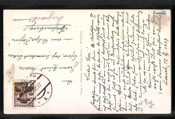 gelaufen 1937, rückseitig Klebe- und Papierreste, rückseitig Oberflächenschaden, guter Zustand