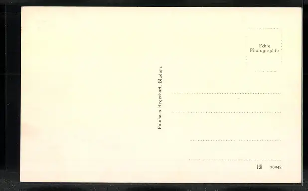 Personenbezogene Daten auf der Rückseite der Karte wurden durch blauen Textmarker unkenntlich gemacht. Die blauen Stellen sind auf die Vorderseite durchgeweicht und wirken sich negativ auf das Postkartenfoto aus