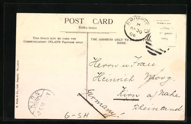 alte Ansichtskarte, gelaufen 1906, Briefmarke entfernt, rückseitig Oberflächenschaden, guter Zustand