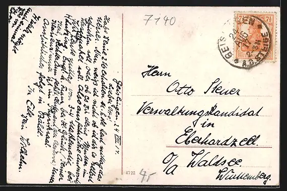 Personenbezogene Daten auf der Rückseite der Karte wurden durch blauen Textmarker unkenntlich gemacht. Die blauen Stellen sind auf die Vorderseite durchgeweicht und wirken sich negativ auf das Postkartenfoto aus