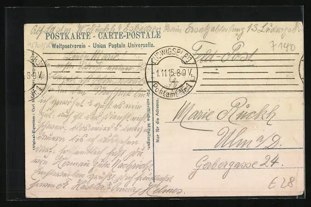 alte Ansichtskarte, gelaufen 1915, Eckknicke unten, guter Zustand