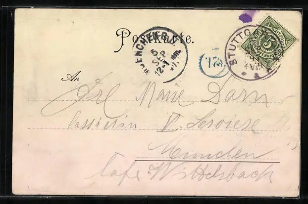 Personenbezogene Daten auf der Rückseite der Karte wurden durch blauen Textmarker unkenntlich gemacht. Die blauen Stellen sind auf die Vorderseite durchgeweicht und wirken sich negativ auf das Postkartenfoto aus