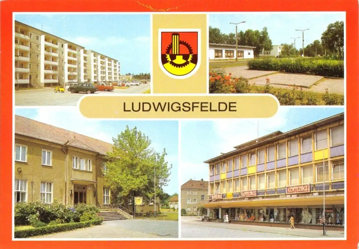 Ansichtskarte Ludwigsfelde Kr. Zossen vier Abb., gestaltet Etgar-André-Str., Potsdamer Str., Kulturhaus-Café, Kontakt-Kaufhaus Erhaltung I-II ungelaufen Druckvermerk: 1987 Herstellungsland: DDR Verlag: Bild und Heimat, Reichenbach i. V. - 01 04 0332/17