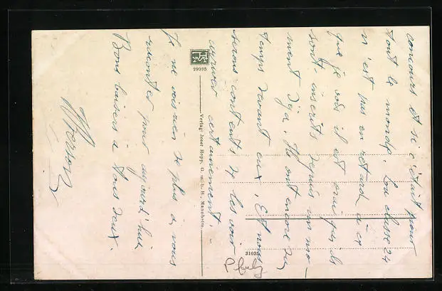 Personenbezogene Daten auf der Rückseite der Karte wurden durch blauen Textmarker unkenntlich gemacht. Die blauen Stellen sind auf die Vorderseite durchgeweicht und wirken sich negativ auf das Postkartenfoto aus