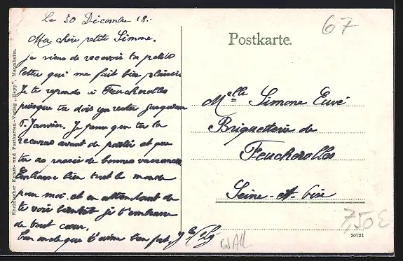 Personenbezogene Daten auf der Rückseite der Karte wurden durch blauen Textmarker unkenntlich gemacht. Die blauen Stellen sind auf die Vorderseite durchgeweicht und wirken sich negativ auf das Postkartenfoto aus