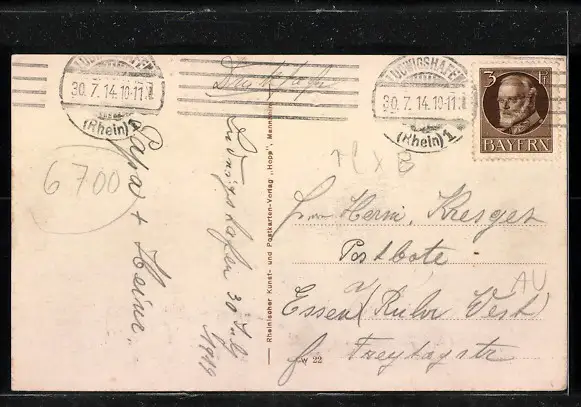 Personenbezogene Daten auf der Rückseite der Karte wurden durch blauen Textmarker unkenntlich gemacht. Die blauen Stellen sind auf die Vorderseite durchgeweicht und wirken sich negativ auf das Postkartenfoto aus