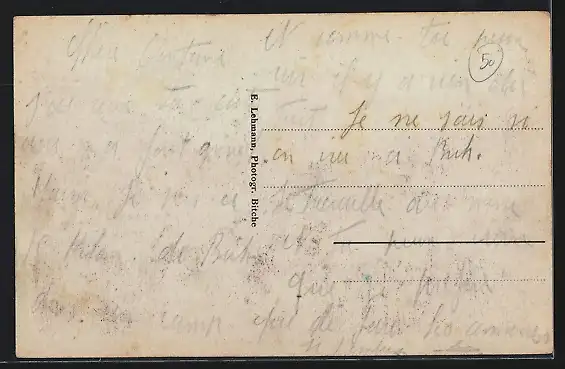 Personenbezogene Daten auf der Rückseite der Karte wurden durch blauen Textmarker unkenntlich gemacht. Die blauen Stellen sind auf die Vorderseite durchgeweicht und wirken sich negativ auf das Postkartenfoto aus