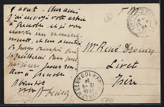 Personenbezogene Daten auf der Rückseite der Karte wurden durch blauen Textmarker unkenntlich gemacht. Die blauen Stellen sind auf die Vorderseite durchgeweicht und wirken sich negativ auf das Postkartenfoto aus