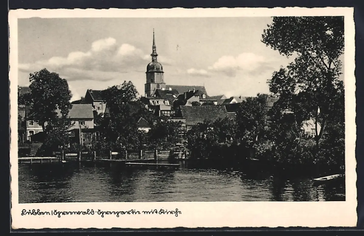 AK Lübben /Spreewald, Stadtansicht mit Kirche und Spree
