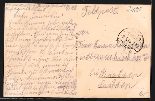 Personenbezogene Daten auf der Rückseite der Karte wurden durch blauen Textmarker unkenntlich gemacht. Die blauen Stellen sind auf die Vorderseite durchgeweicht und wirken sich negativ auf das Postkartenfoto aus