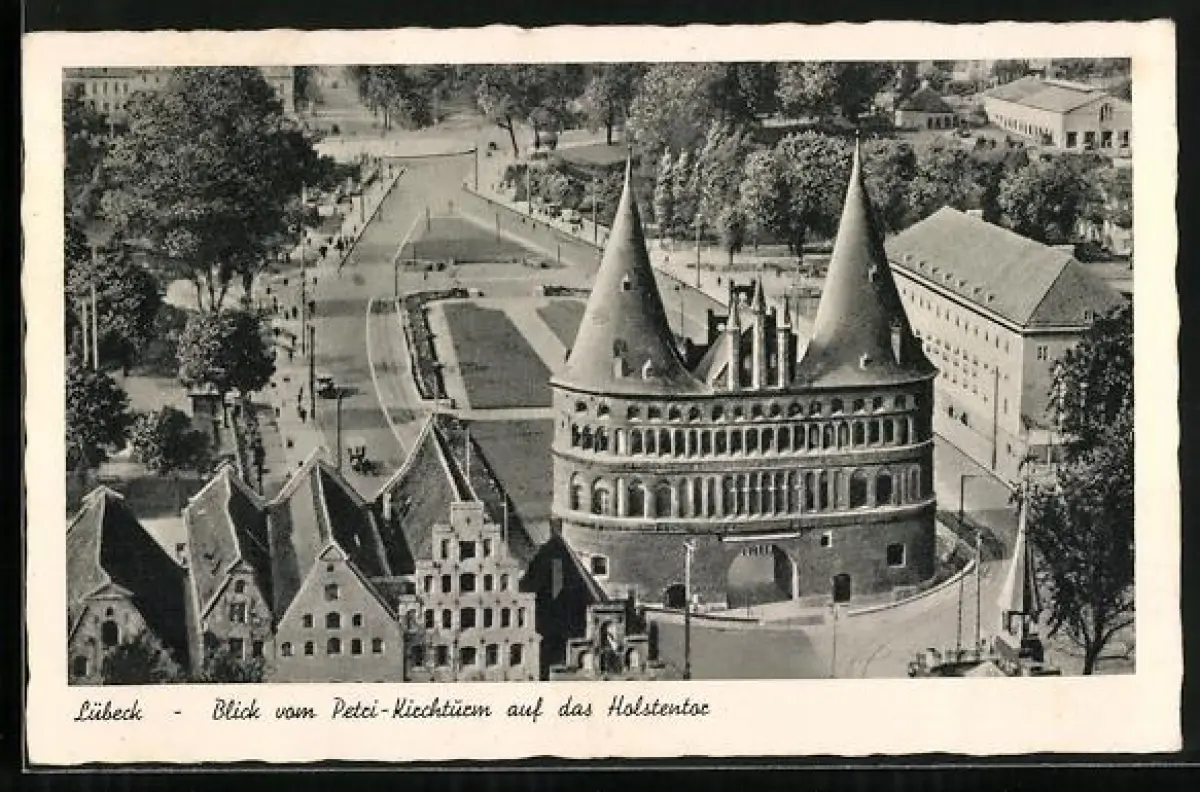 AK Lübeck, Blick vom Petri-Kirchturm auf das Holstentor