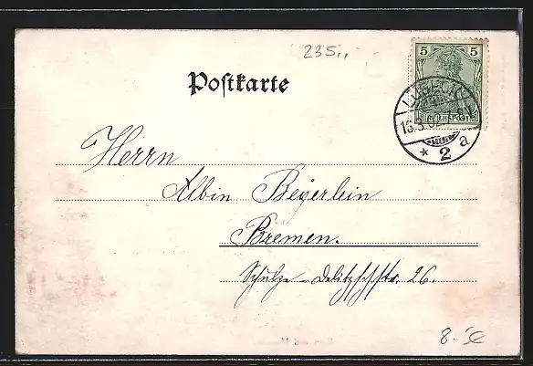 Personenbezogene Daten auf der Rückseite der Karte wurden durch blauen Textmarker unkenntlich gemacht. Die blauen Stellen sind auf die Vorderseite durchgeweicht und wirken sich negativ auf das Postkartenfoto aus